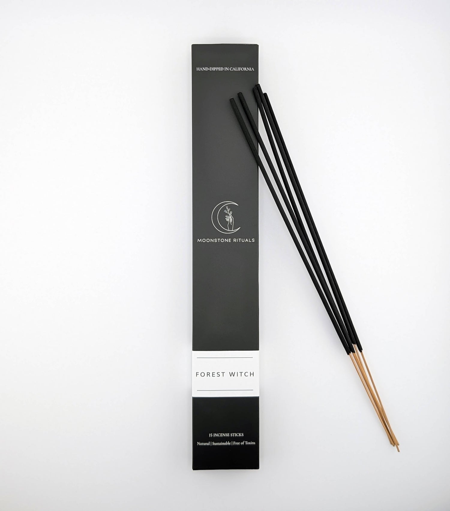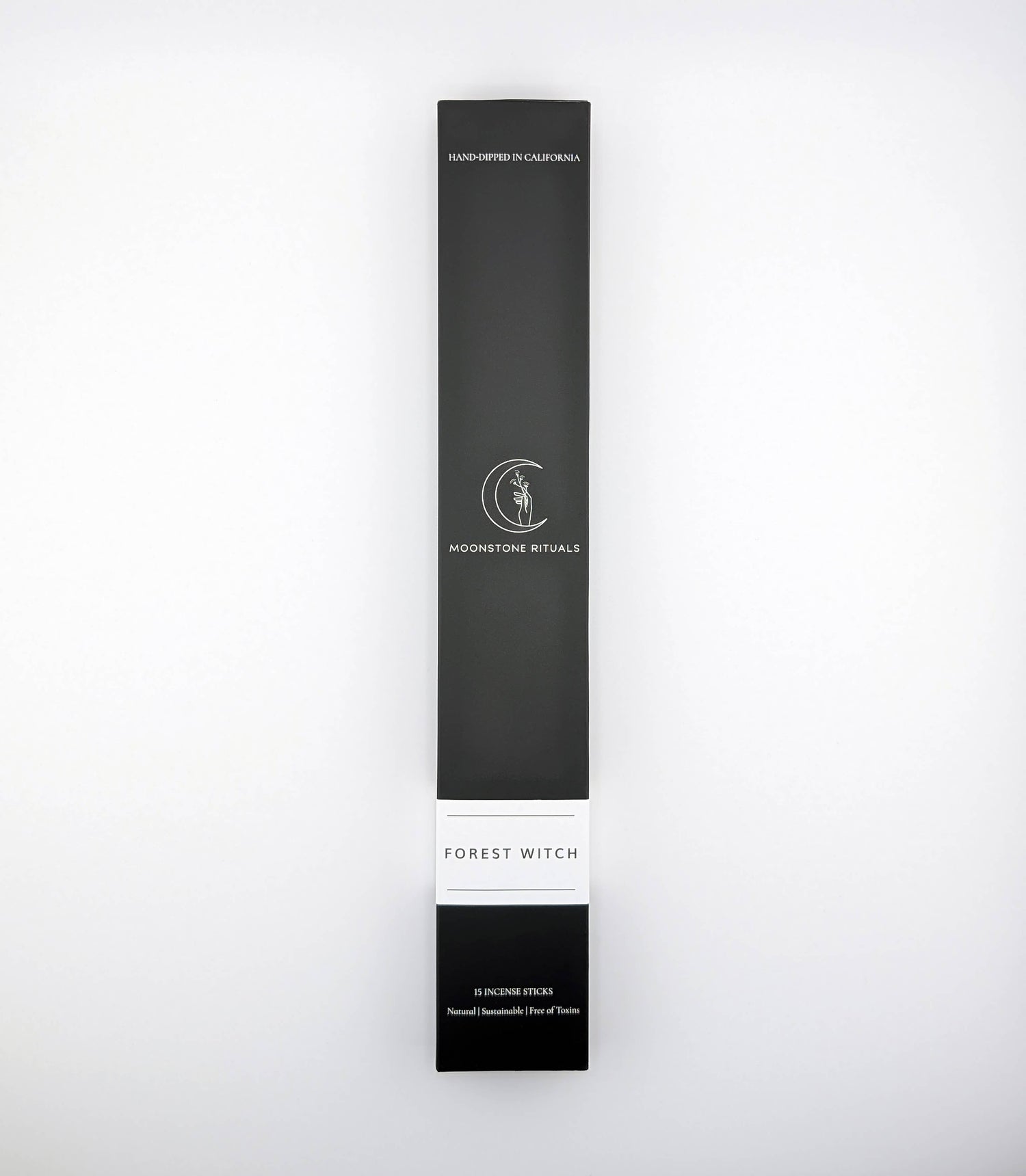 Forest Witch, crafted to evoke the spirit of ancient forest magic. The citrus spark of bergamot blends beautifully with earthy moss, while chai’s warmth weaves through the smoky depths of vetiver. A base of seductive musk lingers, grounding the blend in primal energy. Whether for sacred rituals or a moment of solitude, this incense invites you to embrace the essence of the wild and misty woods. Each sleeve & tray box contains 15 sticks. Our incense sticks measure approximately 11" long and burn for about 60-70 minutes. The scent duration varies depending on the size of the room, typically lasting between 2 to 4 hours. Note: our boxes are made with soy-based ink and are fully recyclable. Incense bags and seal-closures are fully compostable. We pride ourselves on our plastic-free packaging.